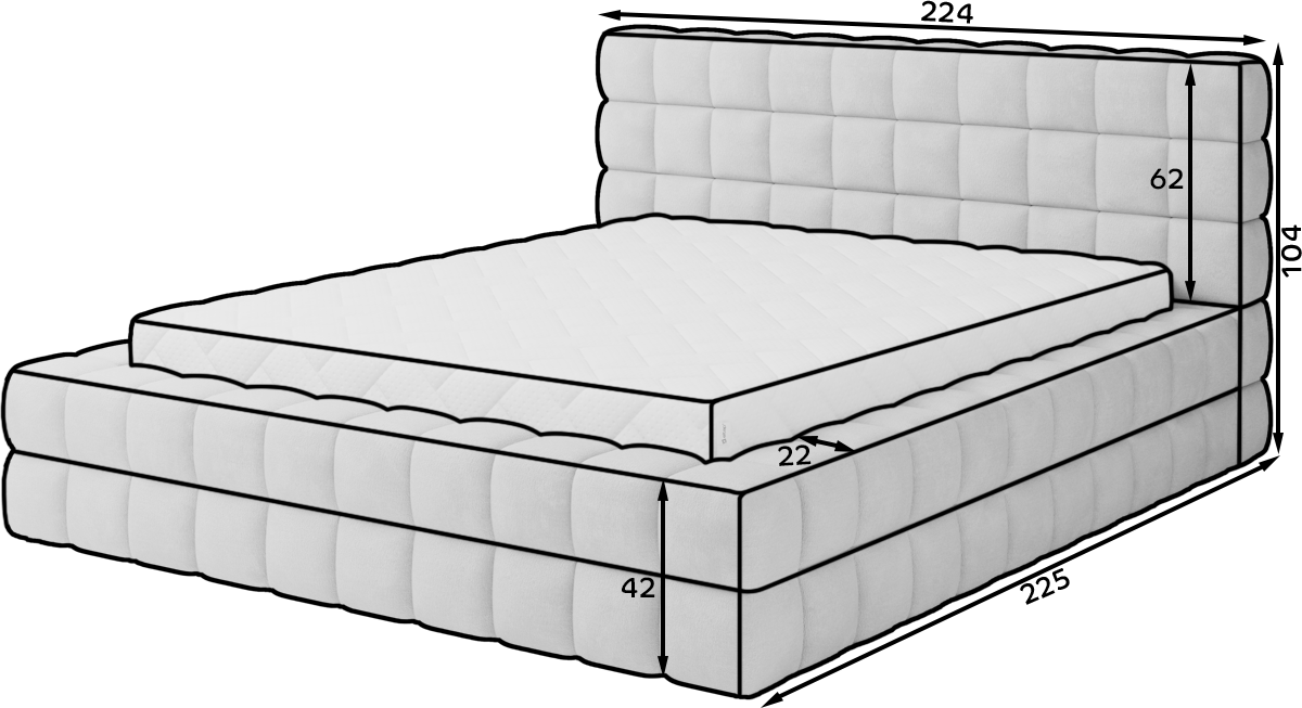 Duljina kreveta je 225 cm, a visina 104 cm, što ga čini impresivnom žarišnom točkom u uređenju interijera. Važno je napomenuti da je visina sjedala 42 cm; Međutim, ne zaboravite dodati visinu madraca za potpunu udobnost. Metalni okvir osigurava trajnost, a uključivanje odjeljaka za pohranu čini Dizzle krevet praktičnim rješenjem za spremanje dodatnih predmeta.
