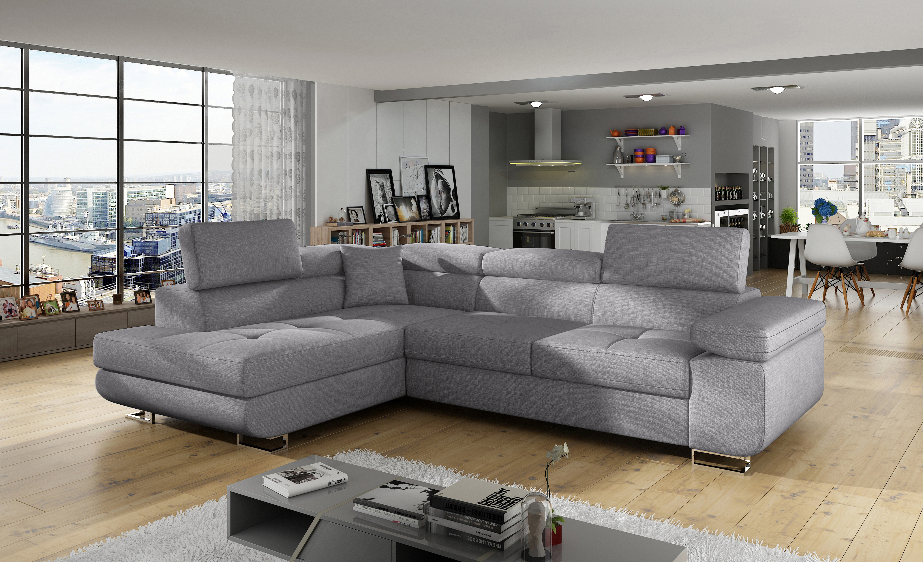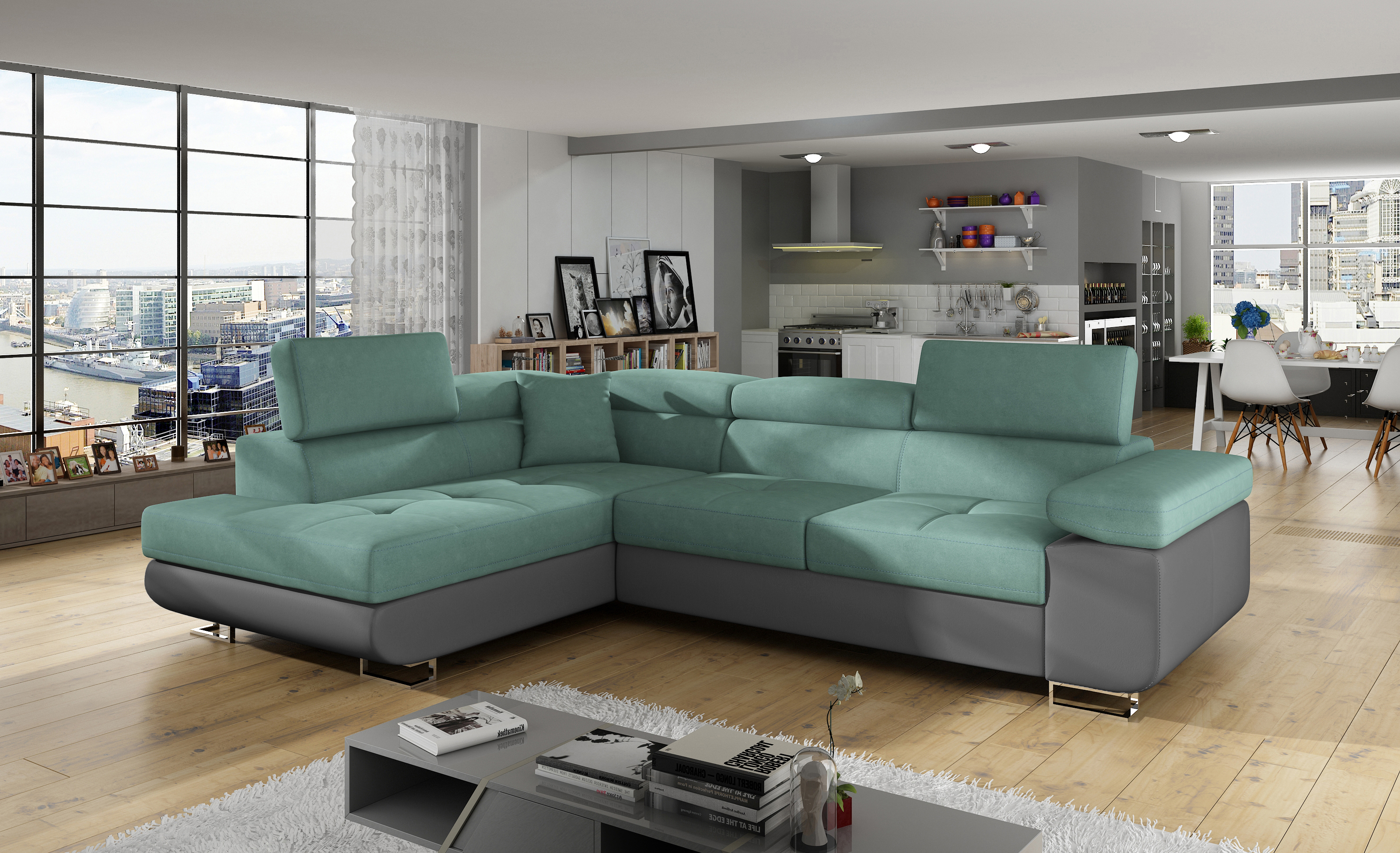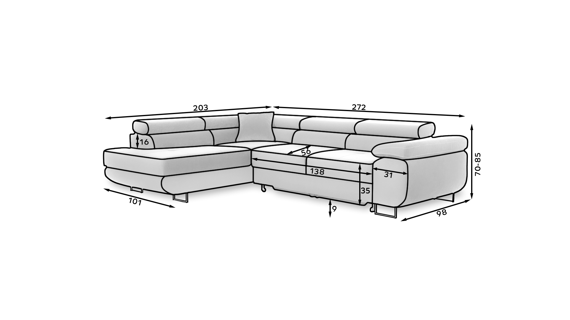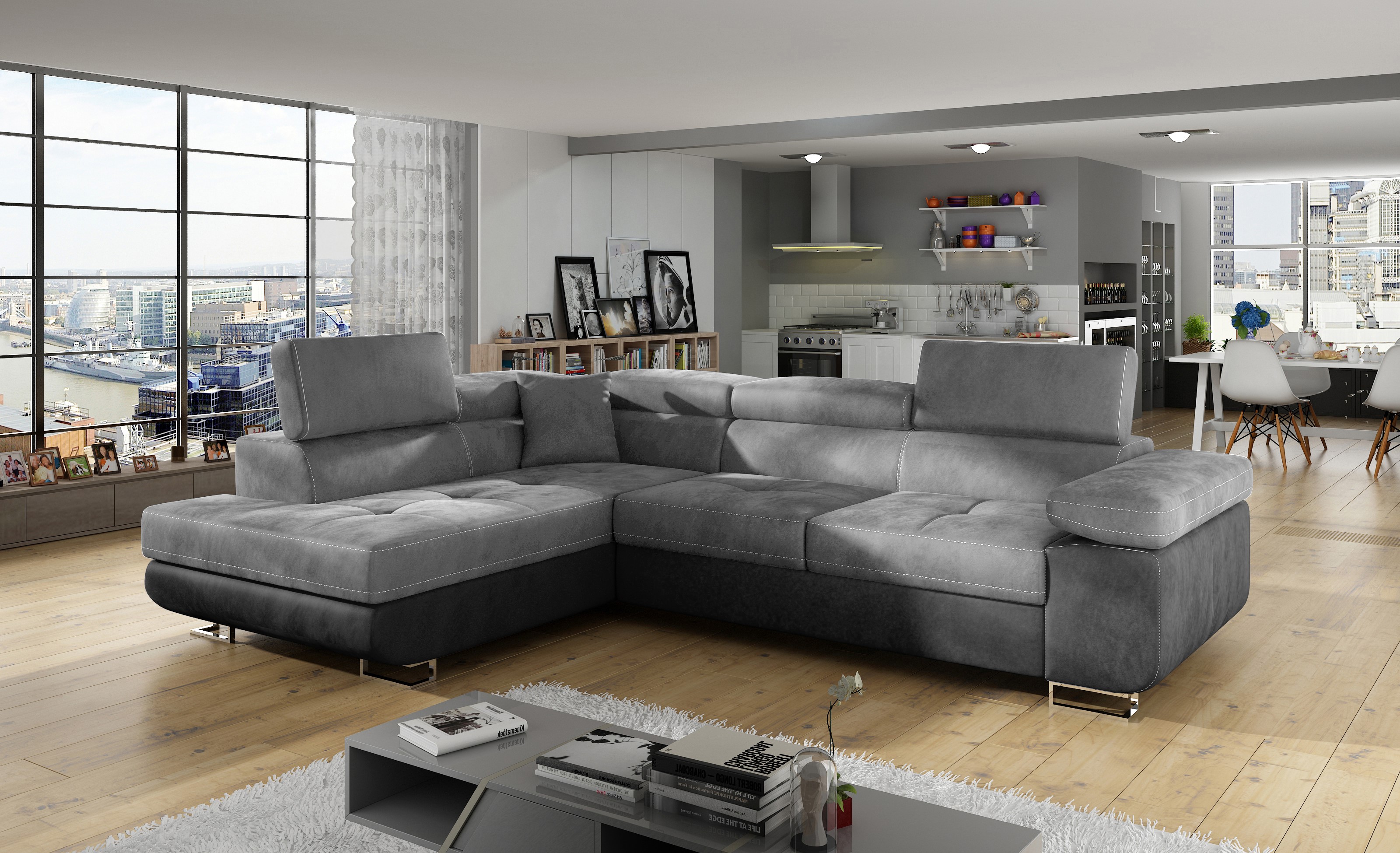 Anton je višenamjenski i prostrani kutni kauč na razvlačenje izrađen u modernom stilu. Sinonim je za visoku kvalitetu i maksimalnu udobnost, zahvaljujući širokom sjedalu dubine 56 cm i iznimno elastičnoj pjeni T3030. Anton, dimenzija 272 x 203 x 85 cm s velikom površinom za spavanje od 123 x 210 cm, znači dobar san. Namještaj također ima veliki pretinac za odlaganje posteljine. Na maksimalni učinak percipirane udobnosti utječu, između ostalog, visoki, podesivi nasloni za glavu, široki nasloni za ruke, kao i metalne noge visoke 9 cm. Ako vas zanima što još Anton nudi - potičemo vas da odaberete naš kutni kauč na razvlačenje1799.99