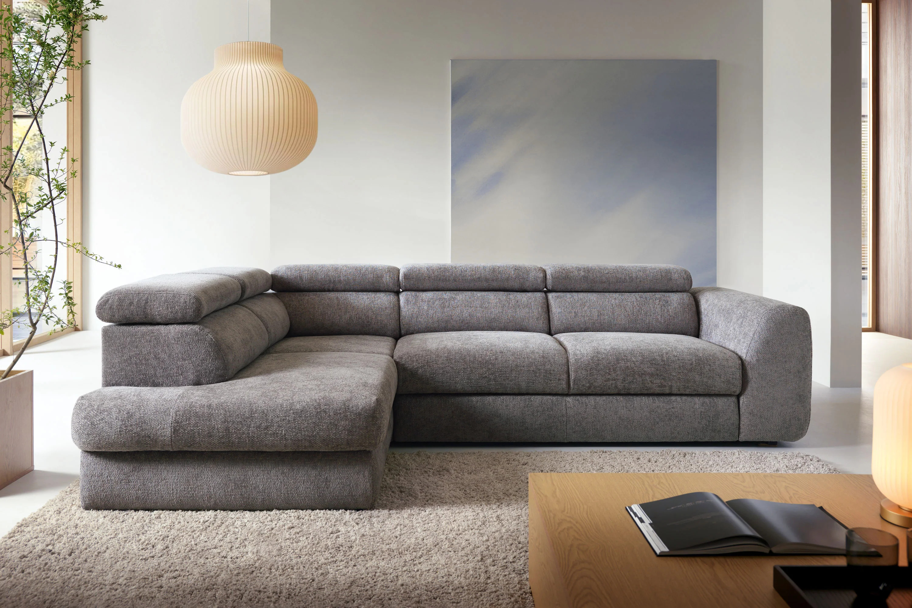 Kutna garnitura Bluvel II prikazana na fotografiji odlikuje se modernim, minimalističkim dizajnom koji spaja eleganciju s udobnošću. Evo ključnih elemenata njegovog dizajna: Kutna garnitura modernog je L oblika što je čini praktičnim rješenjem za prostrane dnevne sobe. Njegov izduženi dio (kauč) predstavlja dodatnu površinu za odmor u poluležećem položaju. Bluvel je opremljen podesivim naslonima za glavu koji se mogu podešavati prema vašim potrebama, što povećava udobnost sjedenja. Nasloni za glavu imaju jednostavnu, geometrijsku formu, koja naglašava moderan karakter namještaja. Sjedalo i naslon za leđa su debeli, mekani i pružaju duboku potporu, što potiče ugodno opuštanje. Masivne, ravne linije ovih elemenata dodaju čvrstoću i uravnotežen izgled kutnoj garnituri. Bočni nasloni za ruke su široki i imaju zaobljene, meke rubove. To čini namještaj ugodnijim i skladnijim, što je u kontrastu s njegovim jednostavnim, geometrijskim linijama. Kutna garnitura Bluvel II spaja minimalistički dizajn s funkcionalnošću, nudi udobno mjesto za odmor i opuštanje, a savršeno se uklapa u moderne, elegantne interijere.