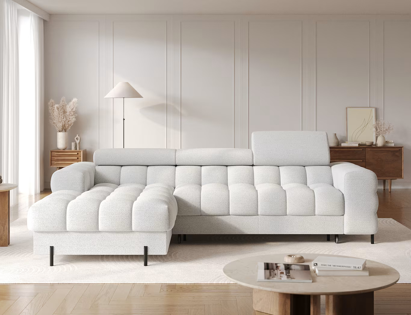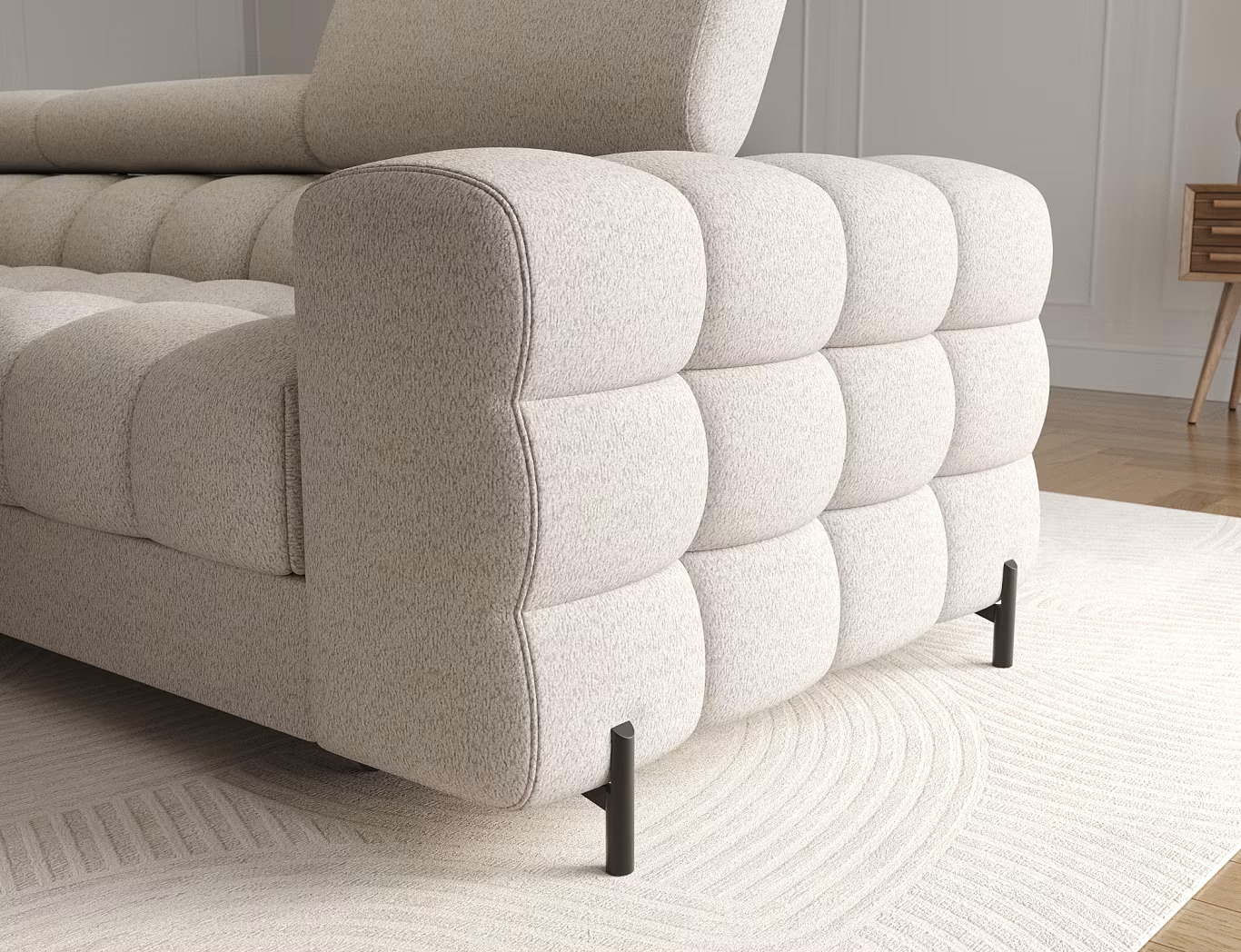 Kutna garnitura Felro spoj je modernog dizajna, udobnosti i funkcionalnosti. Sjedalo kutne garniture ispunjeno je valovitim oprugama tipa B, kao i visokokvalitetnom pjenom T3030 i HR3030, osiguravajući iznimnu udobnost kako za svakodnevnu upotrebu tako i za opuštanje. To čini namještaj ne samo mekim i fleksibilnim, već i otpornim na deformacije, jamčeći dugotrajnu trajnost. Njegovu čvrstu konstrukciju podupiru metalne noge koje su praškasto lakirane crnom bojom, dodajući elegantan i moderan štih cijelom dizajnu. Felro također ima funkciju spavanja, što ga čini savršenim izborom za dnevnu sobu u kojoj su i stil i praktičnost važni. Sklopivi mehanizam "Dolphin" omogućuje jednostavnu i brzu transformaciju kauča u udoban prostor za spavanje. Dodatna prednost je potpuno tapecirana leđa, što omogućuje kauču da izgleda sjajno iz svakog kuta i da se postavi i uz zid ili u središte sobe. Cijeli dizajn slijedi moderan stil, što Felro čini savršenim za suvremene interijere, dodajući eleganciju i funkcionalnost.