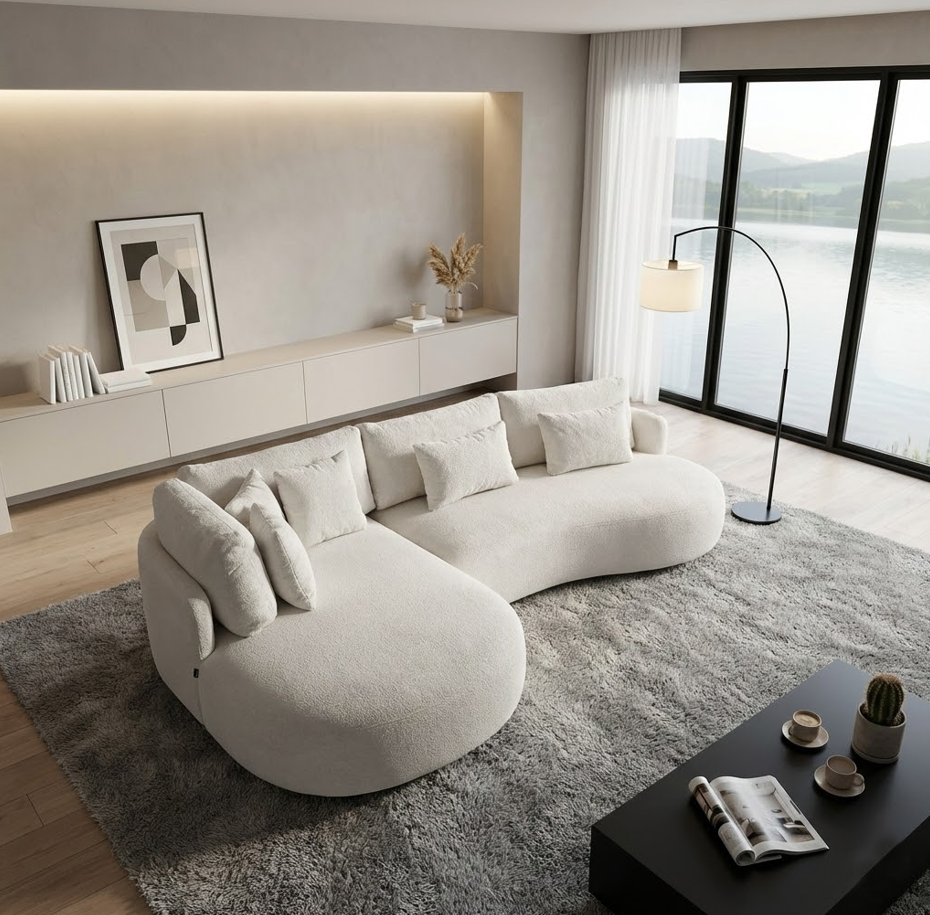 Ova elegantna kutna garnitura ističe se suvremenim, organskim linijama i iznimnom udobnošću. Mekano tapecirana sjedala i zaobljeni oblici stvaraju osjećaj luksuza i topline, dok minimalistički dizajn omogućuje lako uklapanje u moderne, skandinavske i neutralno uređene interijere.
