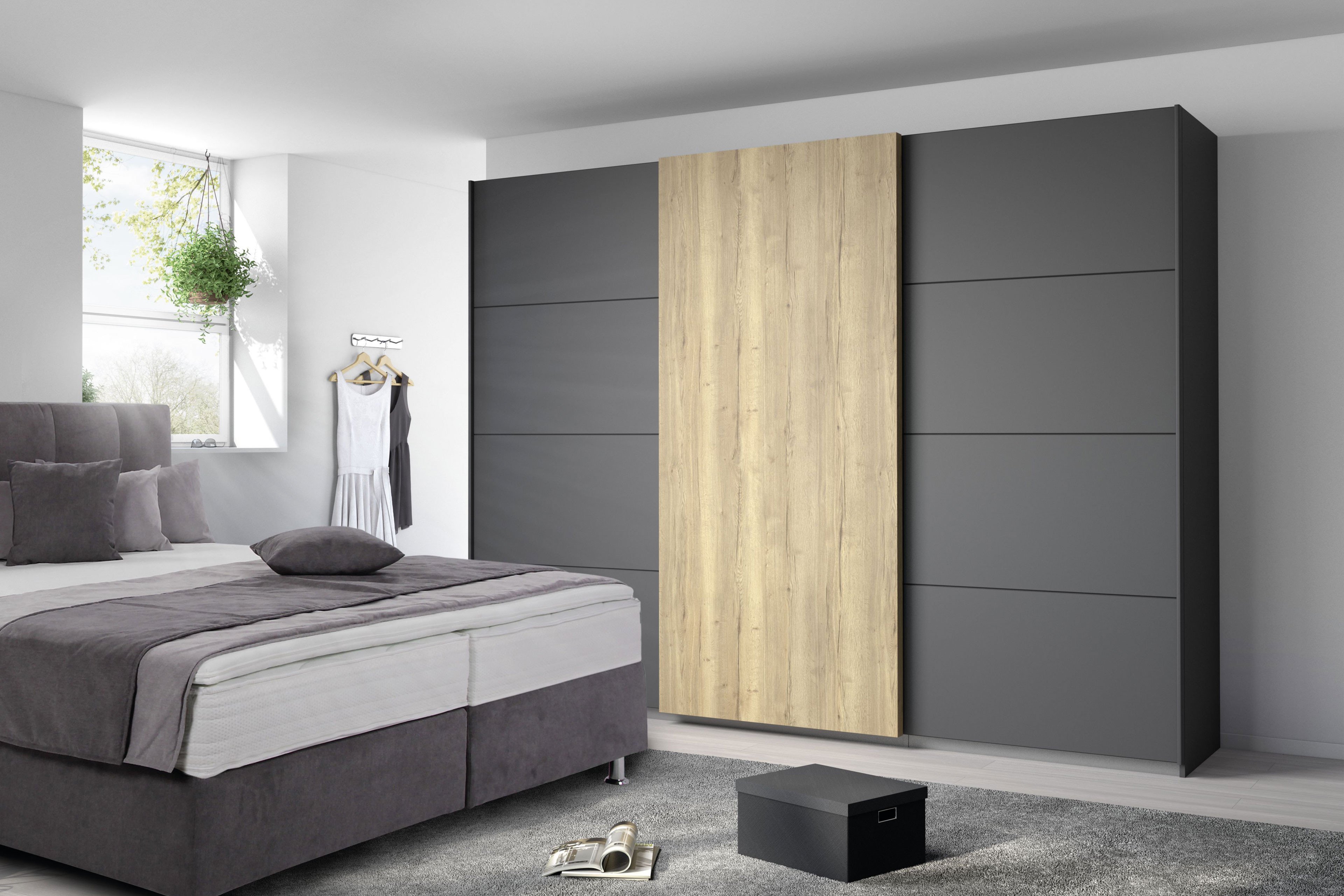 Ormar s kliznim vratima Halifax karakterizira bezvremenski izgled i atraktivan prednji dizajn. Dvoja vanjska klizna vrata u sivoj metalik boji predstavljaju idealan kontrast srednjim vratima u dekoru Halifax hrasta.3 pretinca, svaki 90 cm, obećavaju dovoljno prostora za pohranu odjeće.